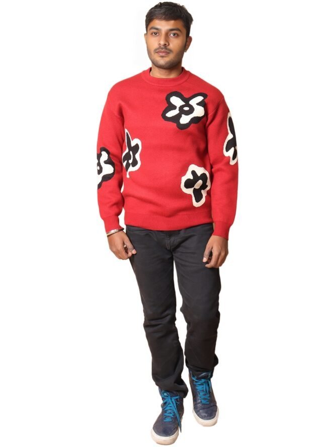 Make a bold statement with this vibrant red sweater featuring striking black-and-white floral patterns. Perfect for adding a pop of color and personality to your winter wardrobe.