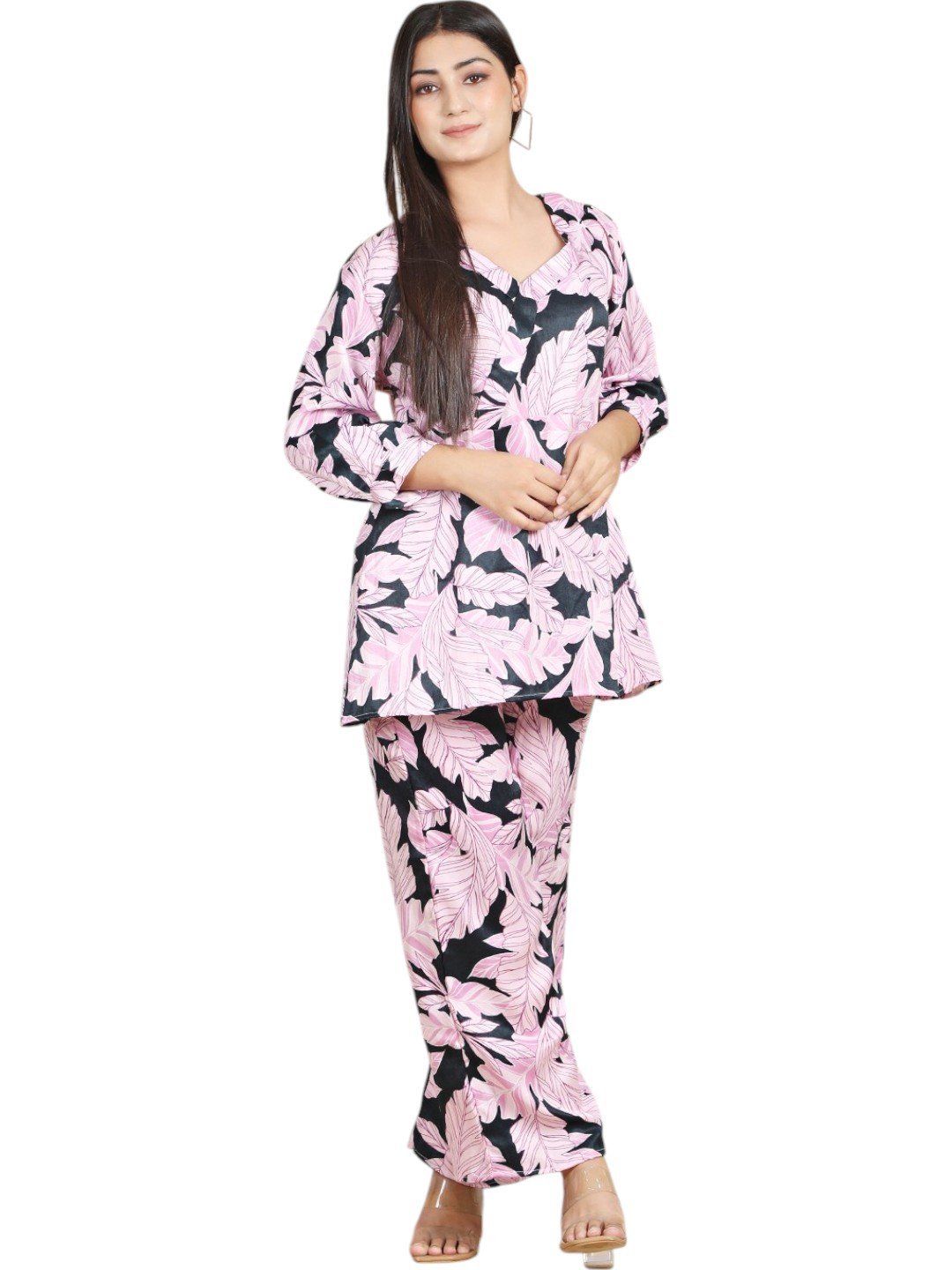 - Stylish Co-ord Set: A chic two-piece outfit featuring a hip-length top and straight-fit pants in a bold pink and black leaf print.