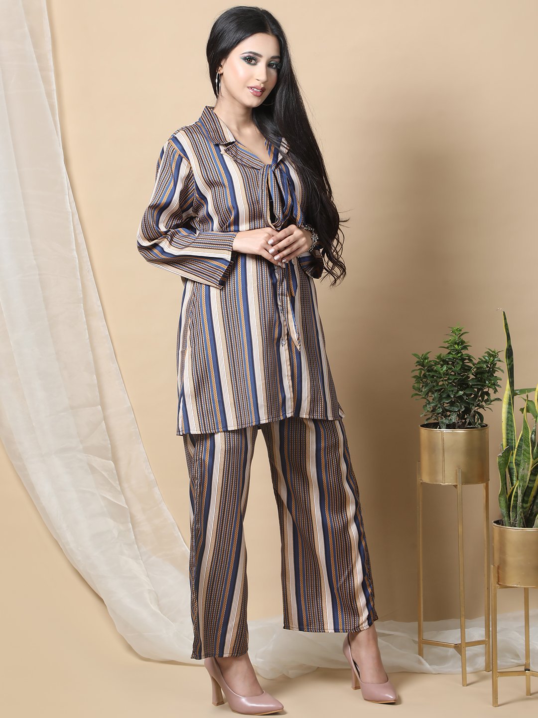Chic Women’s Co-Ord Set – Printed Shirt & Striped Pants