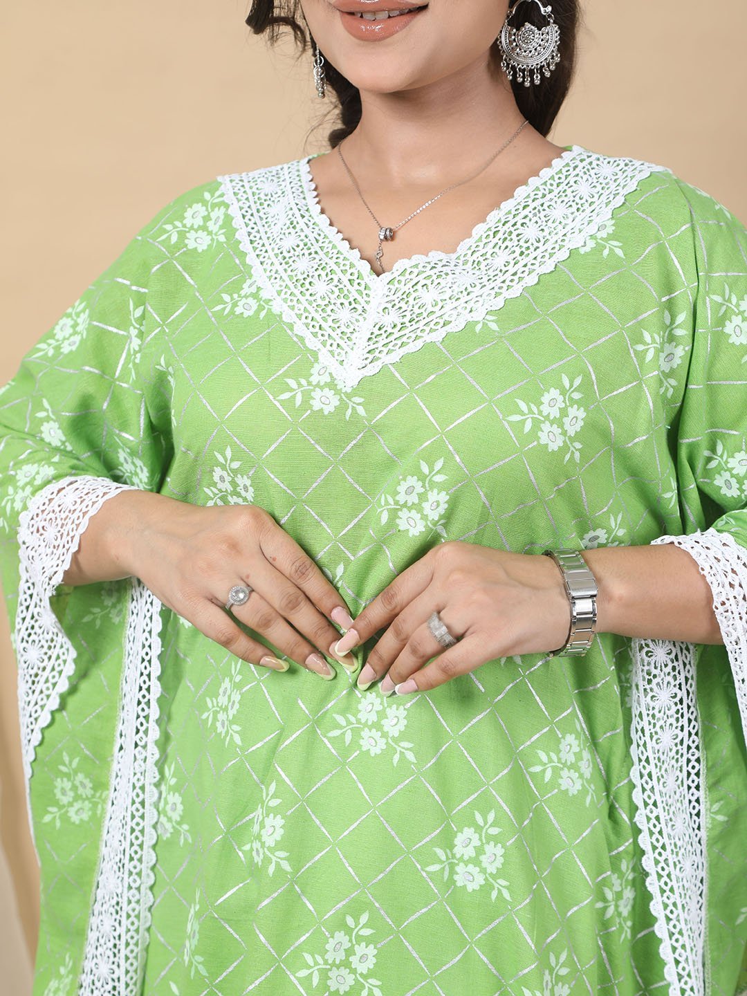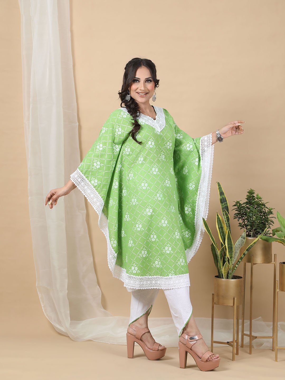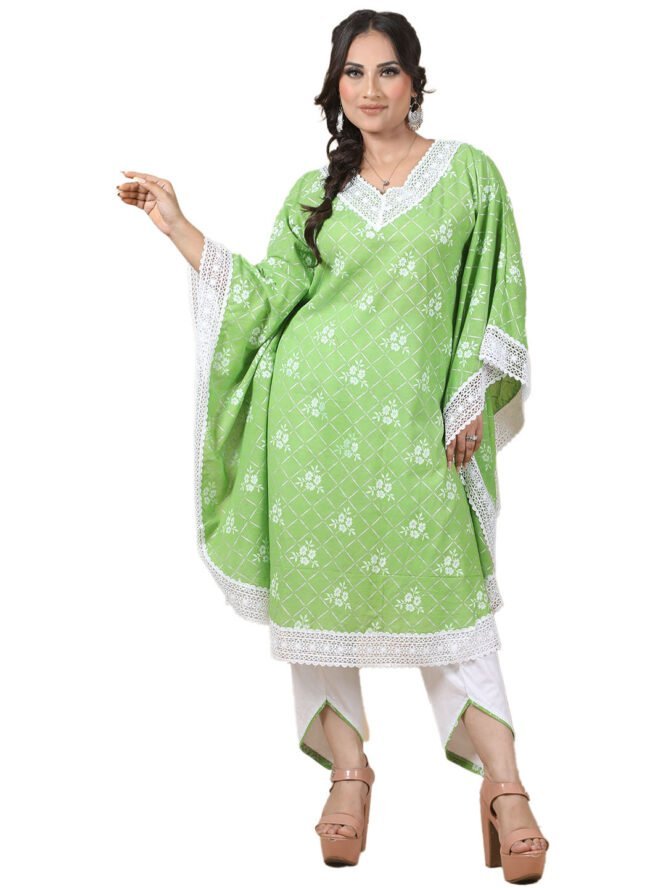 Made from breathable cotton fabric, this kaftan set offers a blend of style and comfort. The green kaftan is adorned with a delicate white floral and geometric print, complemented by intricate white lace detailing along the neckline, hemline, and sleeve edges. The flowy design with a V-neckline ensures a flattering fit. Paired with white asymmetrical pants, this set is a stylish and versatile choice for any occasion.