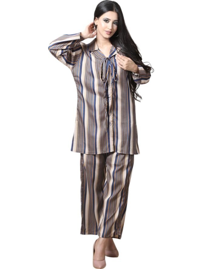 Elevate your wardrobe with this chic women’s co-ord set, featuring a printed shirt and striped pants crafted from lightweight crepe fabric. Designed for comfort and effortless style, this set is perfect for casual outings, office wear, or lounging in style.